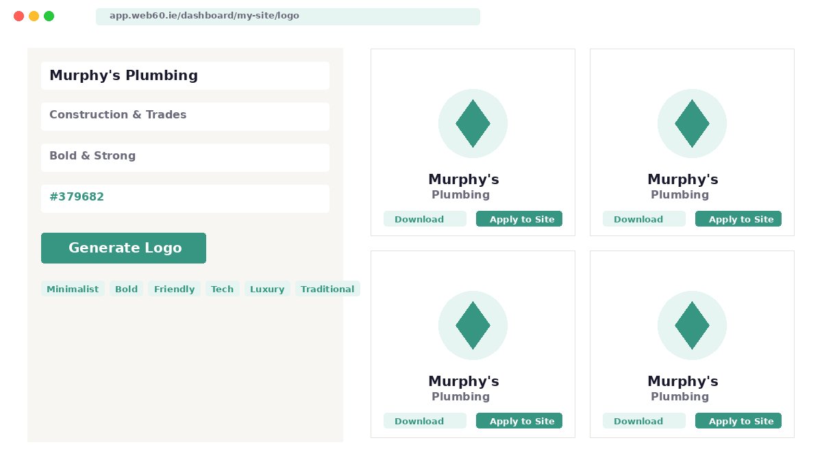 Every Web60 customer can generate up to 3 logos per month at no extra cost. Starter plan customers get 25 generations per month with one-click website application. Pro plan customers get unlimited generations plus brand styles and team sharing. There’s also a free public version on web60.ie for anyone to try.