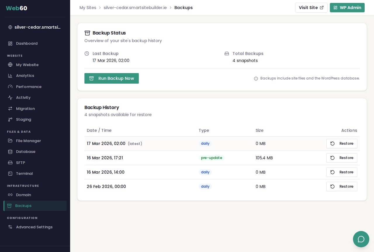 Web60 uses an intelligent backup system that only processes what has changed since the last backup. This means each new backup is extremely efficient and completes in seconds rather than minutes.