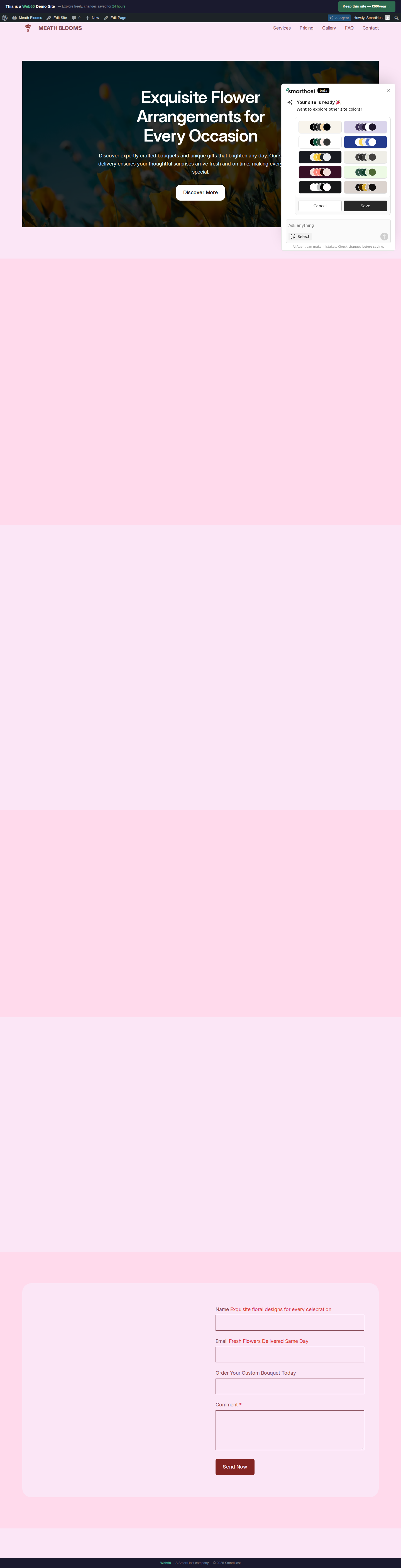 After generation, a panel appears with 8 alternative colour schemes. Click any palette to preview it, then click Save to apply or Cancel to keep the current colours. You can access this panel again at any time from your WordPress admin.