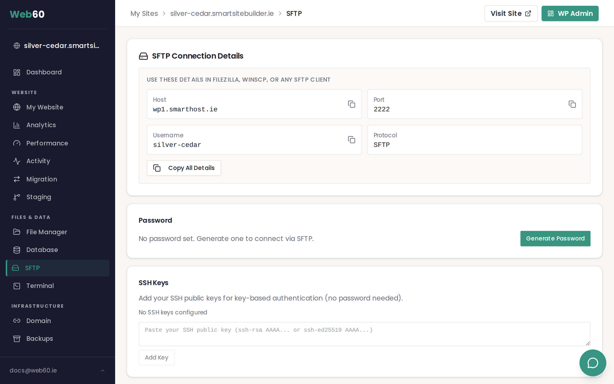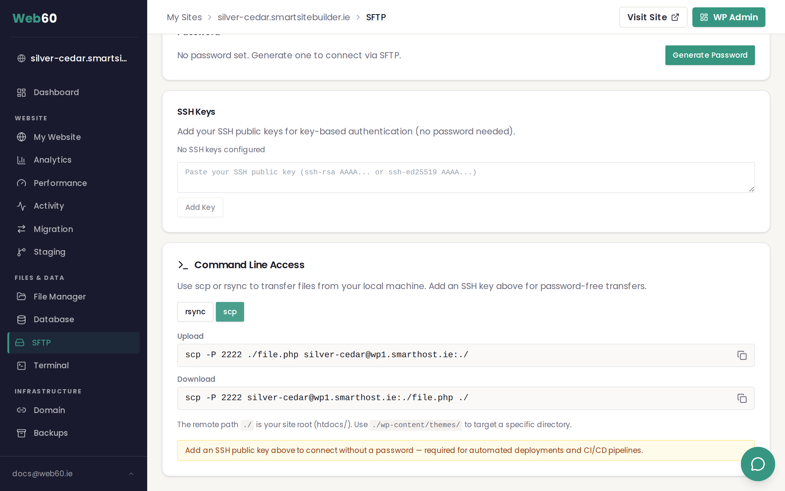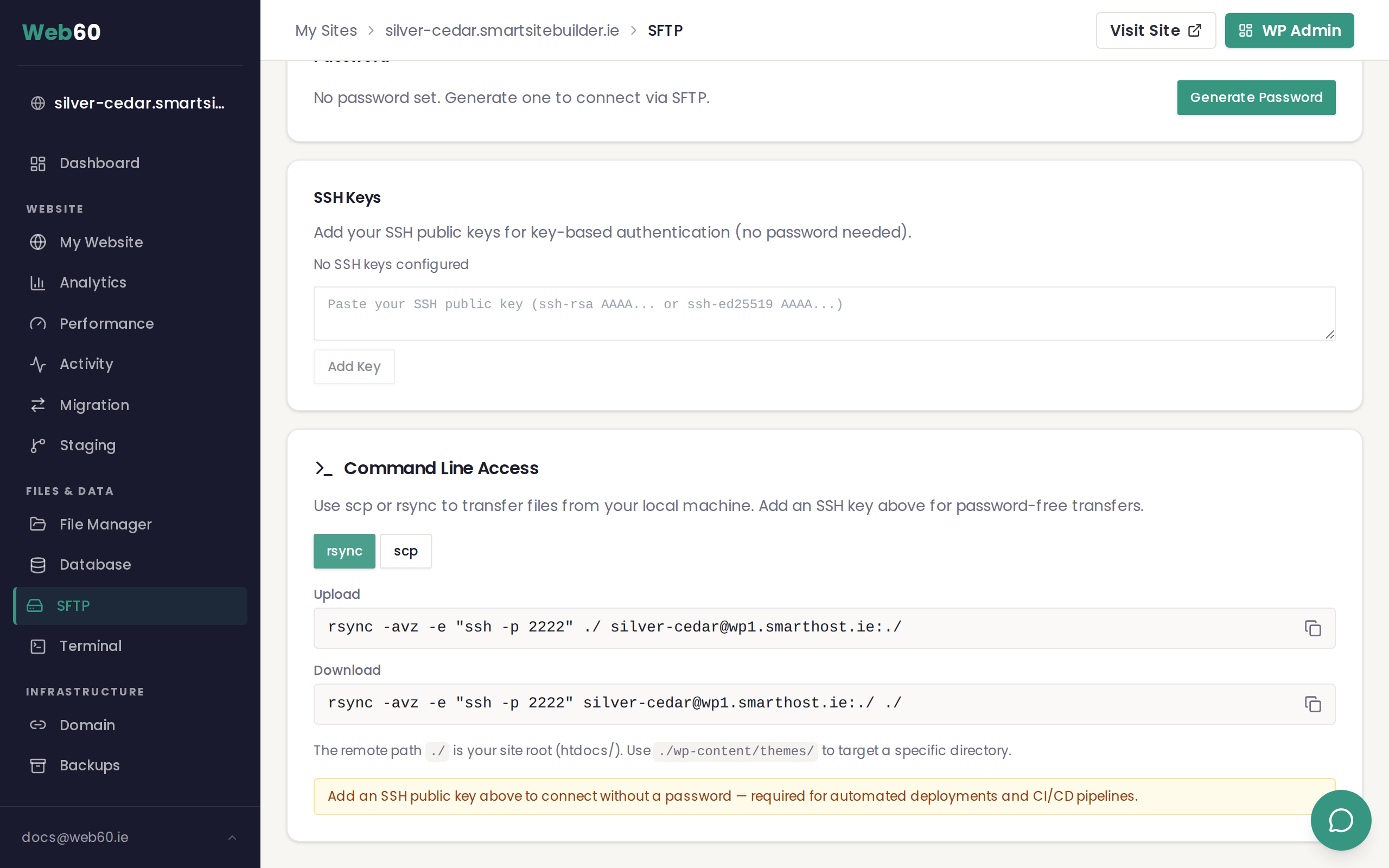 Go to the SFTP page in your Web60 dashboard and paste it into the SSH Keys section.