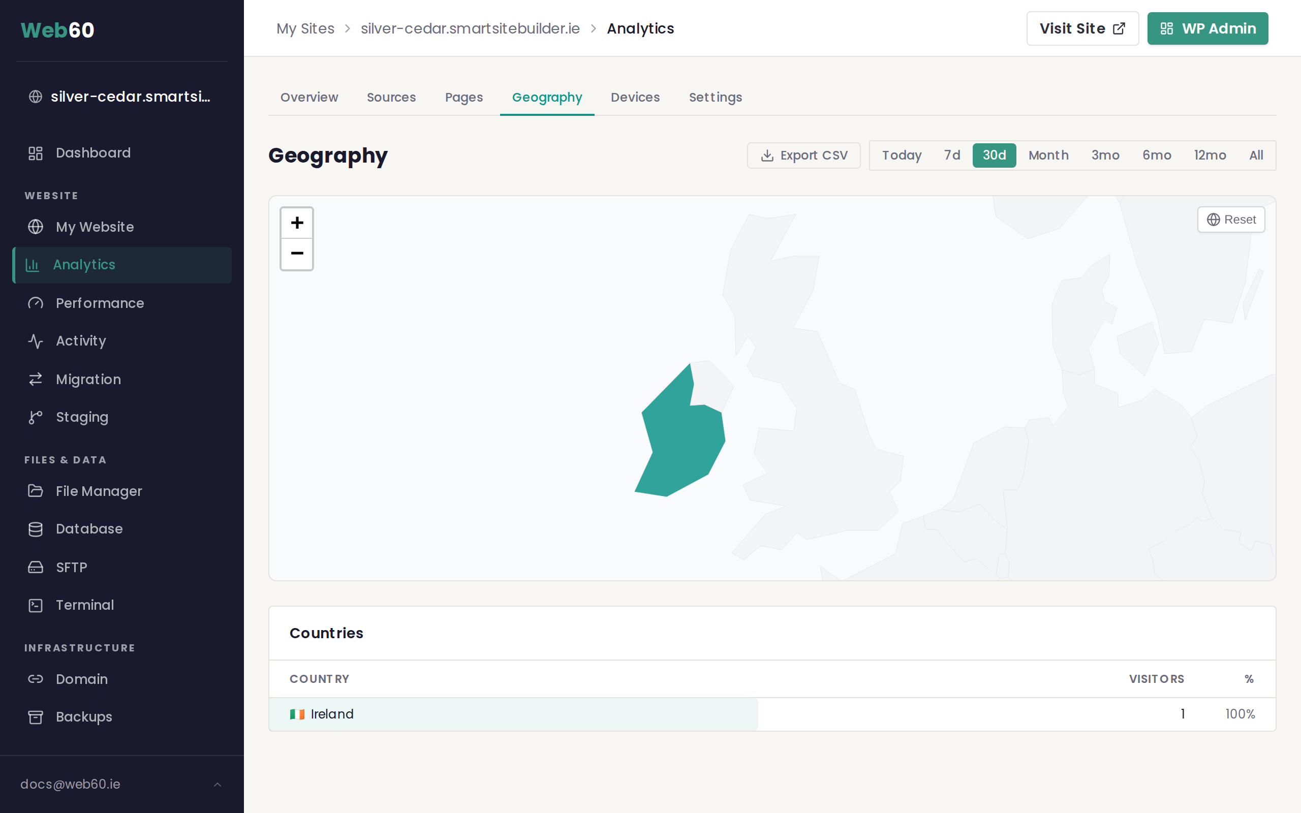 The Geography report in your Web60 dashboard shows where your website visitors are located. For Irish businesses that serve a local or national audience, this is a valuable way to confirm that your site is reaching the right people.