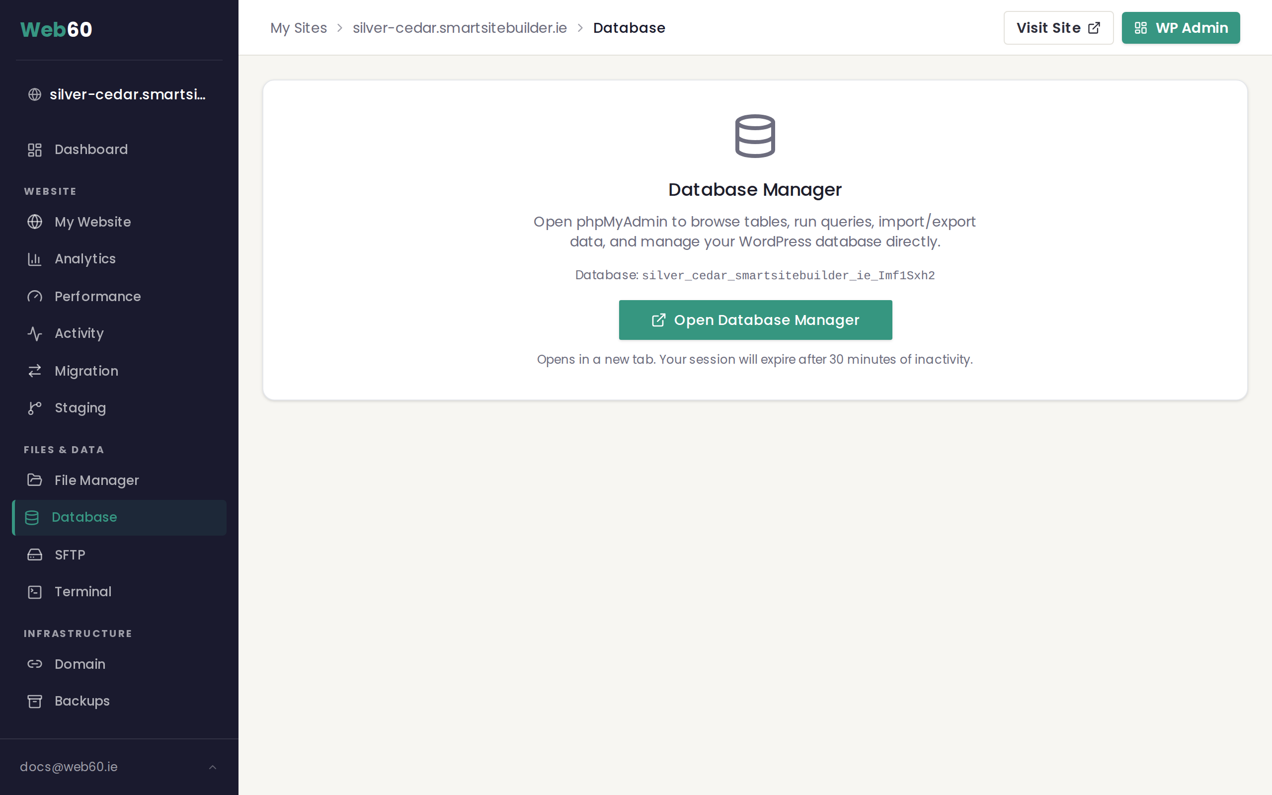 To access it, go to the Database tab in your Web60 dashboard and click Open Database Manager. You are logged in automatically.