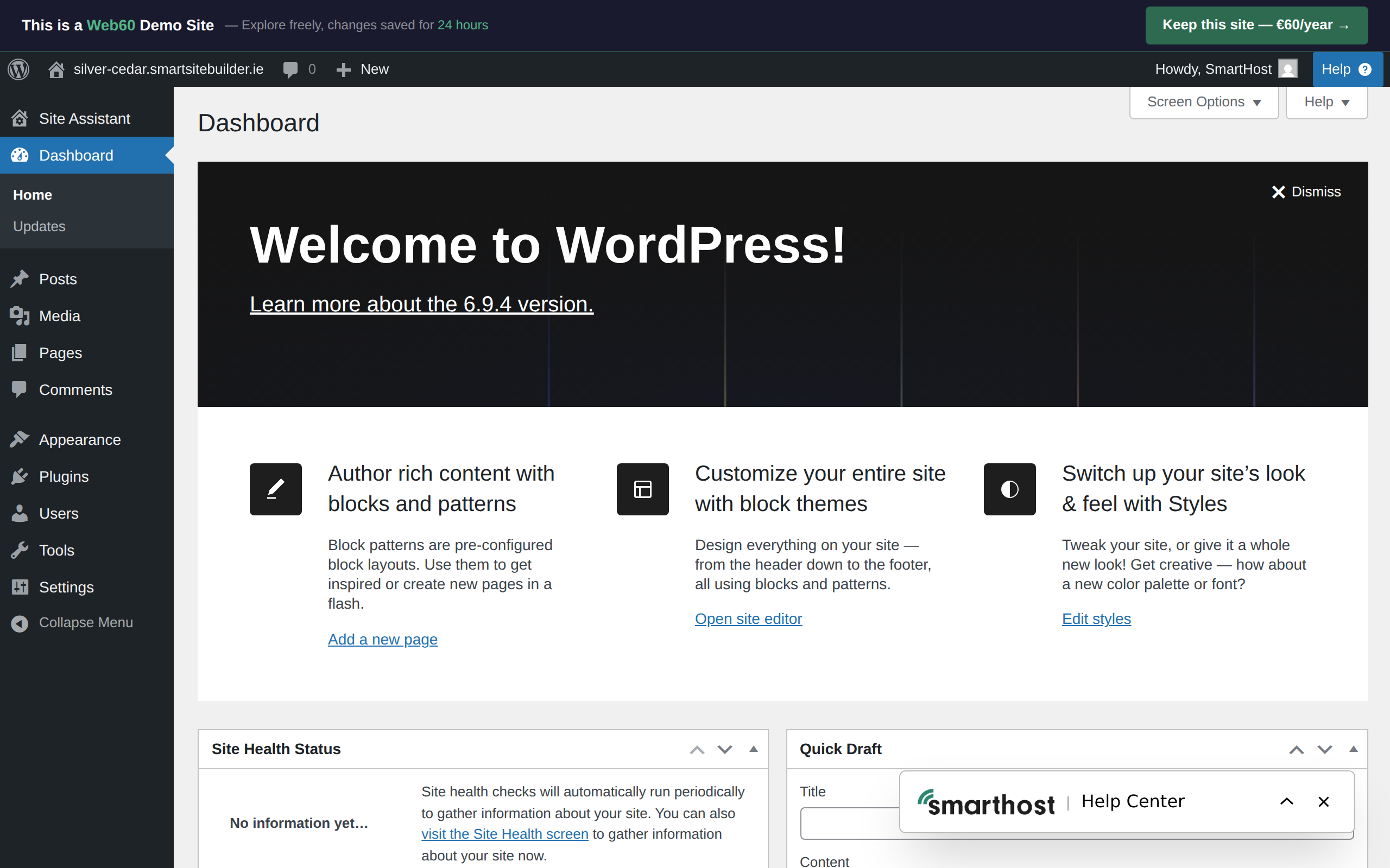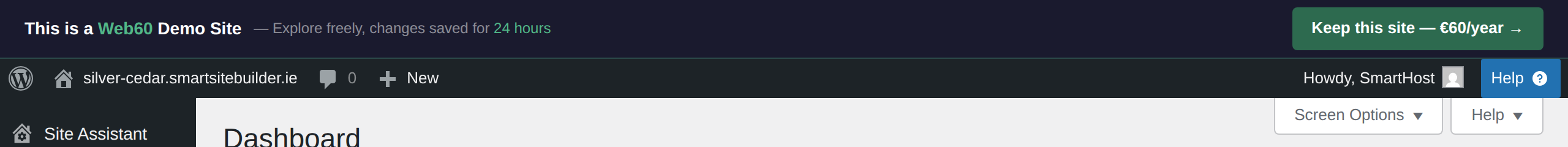 After clicking "WP Admin" from your Web60 dashboard, you'll arrive in your WordPress editor. This is where you manage everything on your website, from writing content to uploading photos. Don't worry if it looks a bit overwhelming at first. This guide will walk you through each section in plain English.