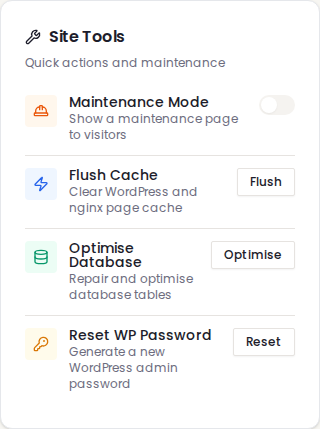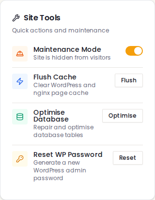 Maintenance mode lets you temporarily hide your website from visitors while you're making changes. Instead of seeing a half-finished page or a messy layout, your visitors will see a polite "site is being updated" message. Once you're happy with your changes, you turn maintenance mode off and your site is back to normal.